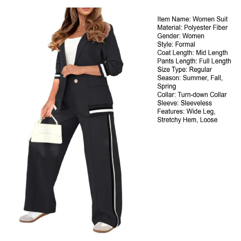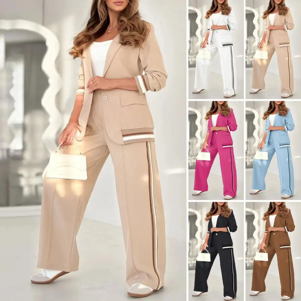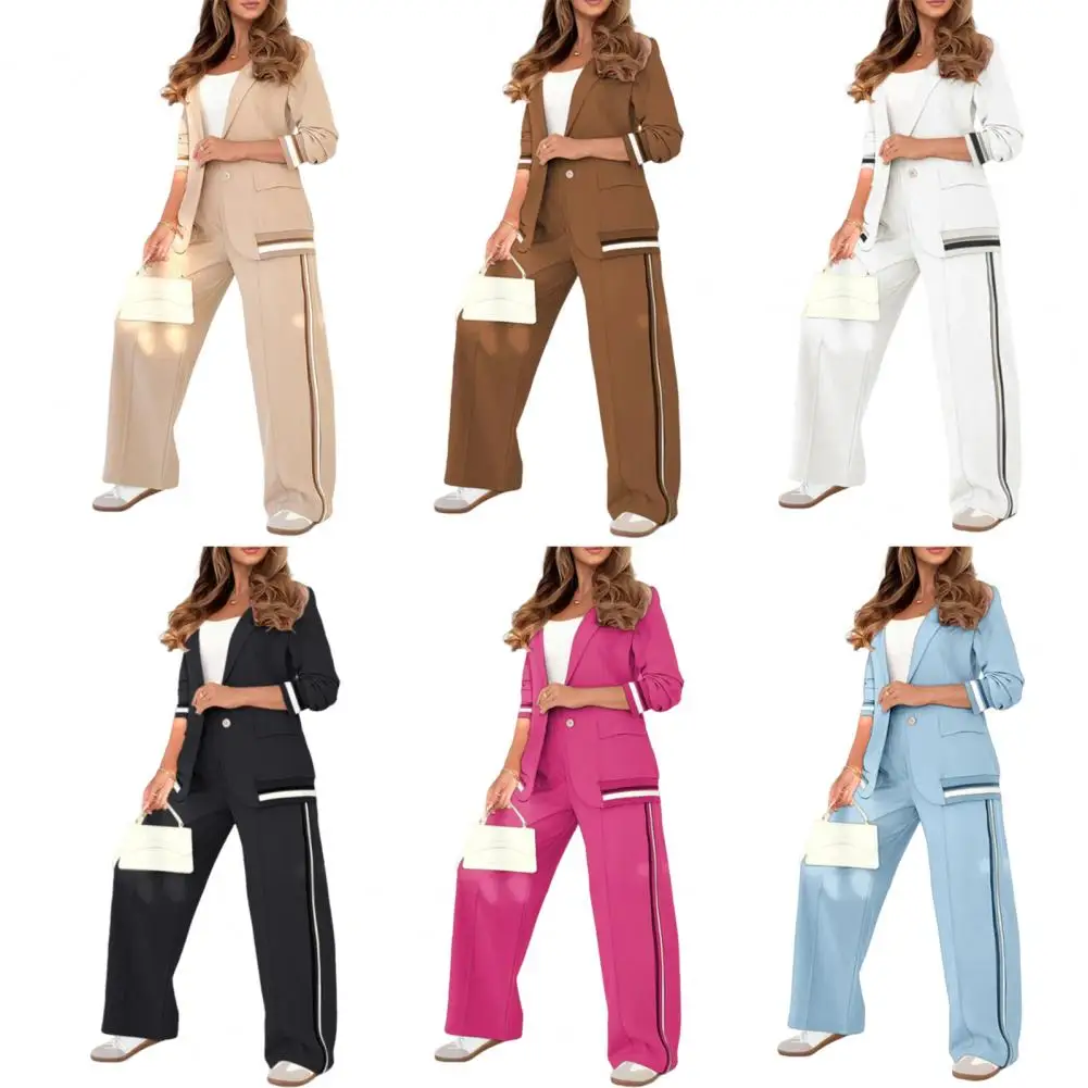 Deze 2-delige set biedt een perfecte balans tussen professionele uitstraling en comfort. De jas met turn-down kraag heeft een elegante, verfijnde uitstraling, terwijl de elastische zoom zorgt voor extra comfort en bewegingsvrijheid. De wijde pijpen broek voegt een trendy en luchtige flair toe, waardoor dit pak ideaal is voor zowel kantoor als het dagelijks woon-werkverkeer.