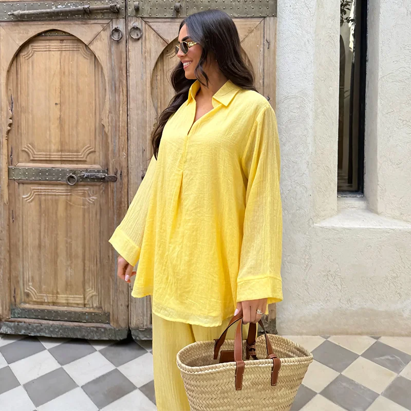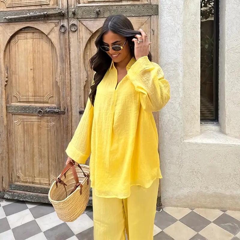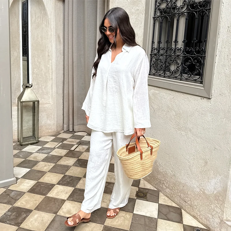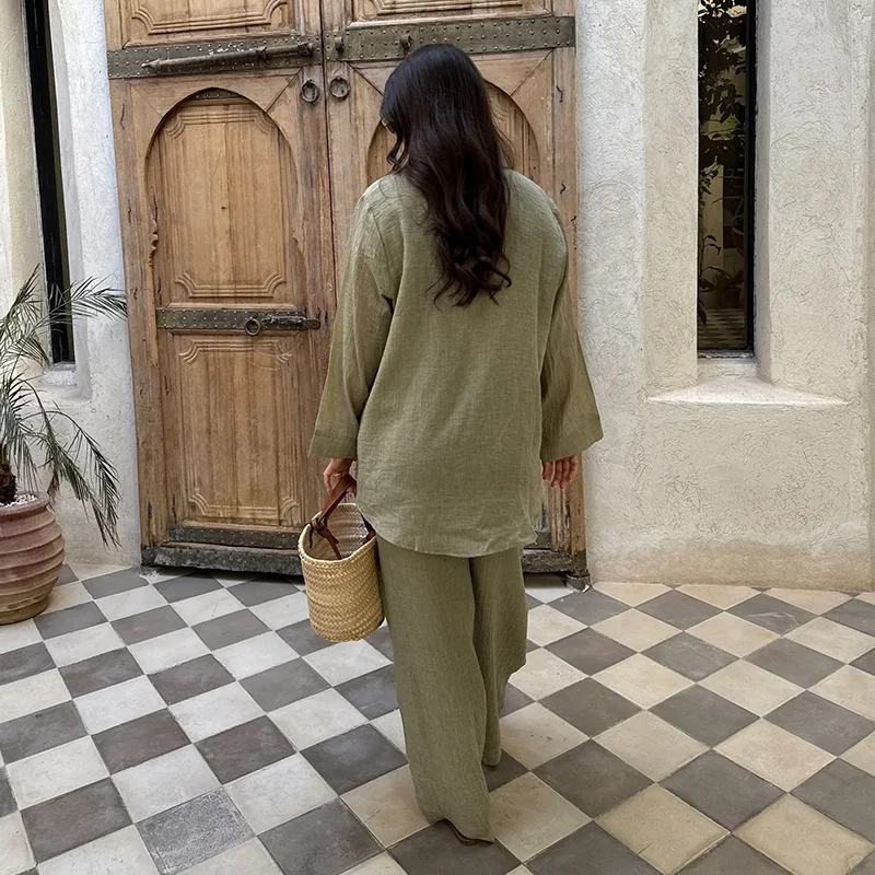 2025 Lente/Zomer Katoen Linnen Damespak – Lange Mouw V-hals Top & Wijde Pijpen Broek